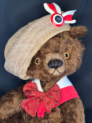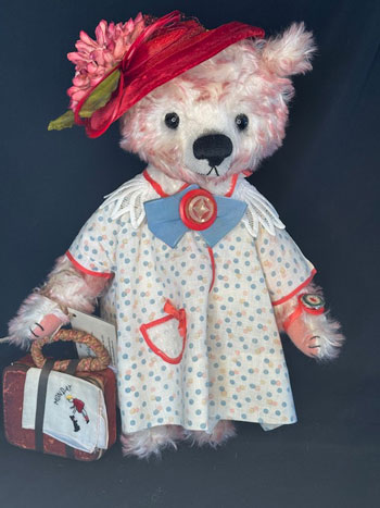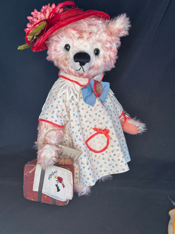 I couldn’t resist this charming polkadot dress from the 1940s and designed the bear around the colors and the size. To the dress I added the additional lace collar bowtie, and multiple buttons. Delighted, I was find the red vintage hat in my stash and the proper flowers to trim it.