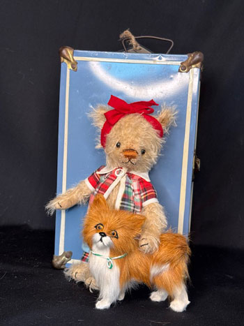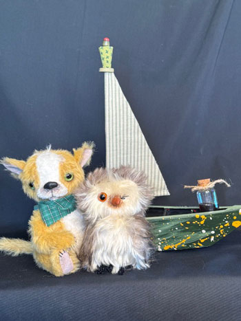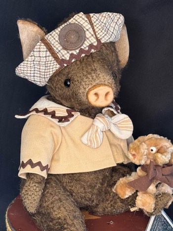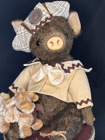 Porgy the Brown mohair pig arrives with his vintage chenille dog friend, in an ecru sailor top and bow tie and old hat.