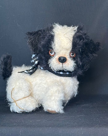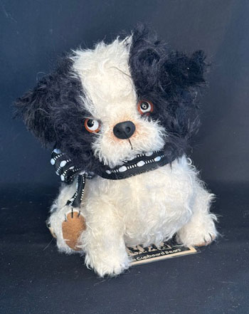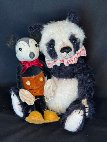 A traditional black and cream curly mohair panda and his replica edition Micky pal.
