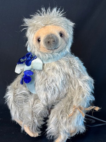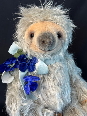 Light grey Mohair on a dark background, makes this little sloth glow.