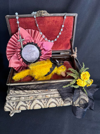 He is made of mohair with lolling head and sightless eyes and was cherished enough to be buried in this reliquary box lined in mohair and decorated with ribbons and floral trim.