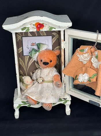 I so enjoy finding these little cupboards for sale and making them into something delightful, showcasing bear ,costume, wallpaper, and small details.