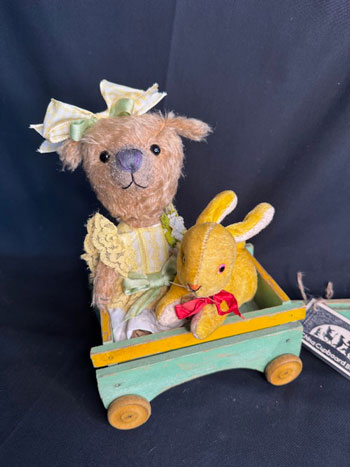 She rides in her little green and yellow wooden wagon along with her old plush made in Japan, bunny with red ribbon, trim, and tiny bell.