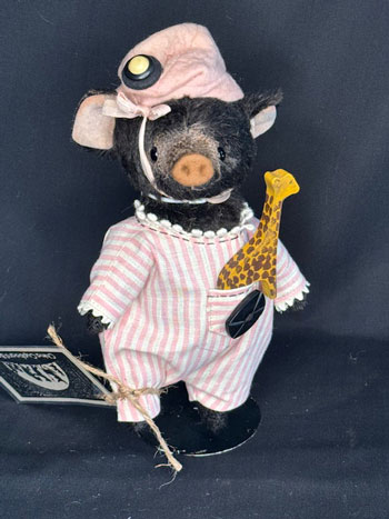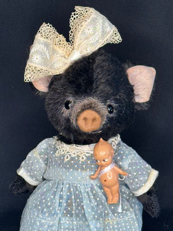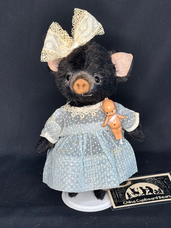 This darling, little pig is fully jointed with German glass eyes and felt snout. She wears a pale blue dotted Swiss vintage dress with a tiny Cupie and antique lace trim.