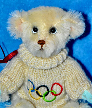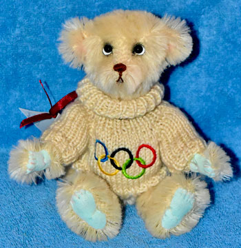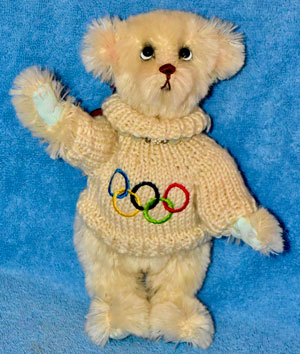 Champ is a 9 inch tall white mohair bear wearing an Olympics sweater. He has shiny black eyes with white surrounds, a brown hand-stitched nose and mouth, and a cute face with a determined expression. He is determined to be a winner! Champ has blue suede pawpads with trapunto stitched toes. (A surprise strand of pearls is hidden under the collar of his sweater). You can adopt Champ for $195. including shipping and insurance within the US. Buyers outside the US, email me for a shipping quote, which will be billed separately after you pay for Champ. brownlindaellen@gmail.com