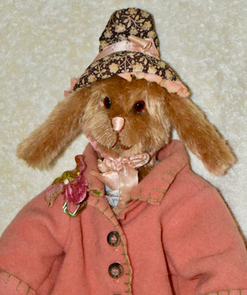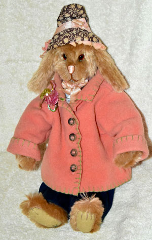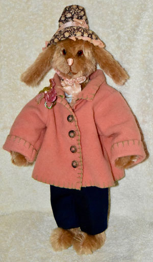 Clarence is a character mohair bunny, 15.5 inches standing, or 10.5 inches sitting. He has honey brown mohair fur and felt foot pads with stitched "toes". Clarence has a cute face, a pink stitched nose outlined with reddish brown floss, a brown mouth, and amber glass eyes. He wears a funny pink and brown bonnet, a pink wool coat, and navy blue pants. Clarence is unique, with a comical charm. You can adopt Clarence for $295. including shipping and insurance within the US. Buyers outside the US, email me for a shipping quote, which will be billed separately, after you pay for Clarence. If you want to discuss lay away, email me at brownlindaellen@gmail.com