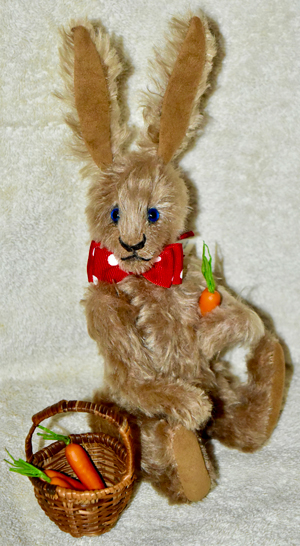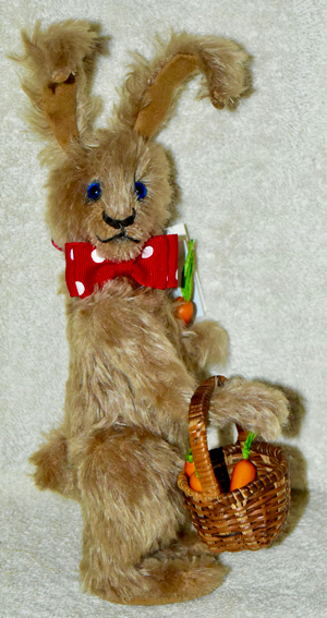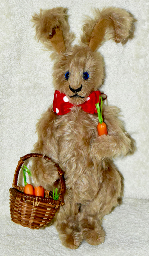 Donny Dibs is an 8 inch tall bunny who has been out in McGregor's garden. He called dibs on 4 juicy carrots and pulled them up, stuck 3 in his basket, and he's holding one in his paw. He is 7 inches tall sitting, not counting his long bendable ears, or up to 10 inches, including the ears fully up. He is 8 inches tall standing with his ears down, or 11.5 inches tall standing with them up. His arms and ears are bendable. His fur is soft fluffy sandy beige mohair. He sports a red polka dot bow tie. His blue eyes are glass, and the pads on the long feet and inner ears are light brown suede. He is signed on a foot. The nose and mouth are stitched. You can adopt Donny Dibs for $275.( including shipping and insurance within the US). He comes with his basket and carrots. Buyers outside the US, please email me at brownlindaellen@gmail.com for a shipping quote, pay for the bunny, and then you will be billed separately for shipping. If you want to discuss a lay away, please just email me.