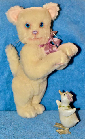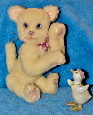 Kitty is 9" tall sitting, 11 inches tall standing. She has a cute perky tail, and is jointed at the neck and all four limbs. She has a little friend to play with, a duckling called "Chirp", who will come along with her. You can adopt Kitty for $350. including shipping and insurance within the US. Chirp will come along with Kitty.
