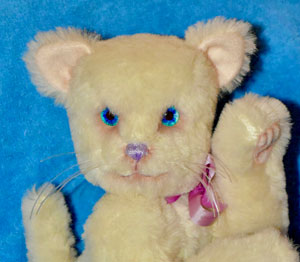 Kitty is a sweet little kitten with big blue glass eyes that have lavender centers, a hand- stitched lavender nose and mouth. Her fur is soft white alpaca, and she has light pink paw pads and inner ears. Her paws have trapunto needle-sculpted toes and shading. She has nylon whiskers.