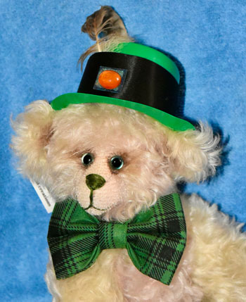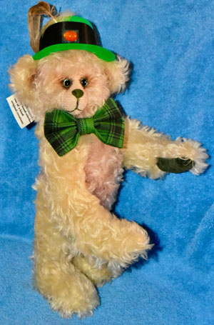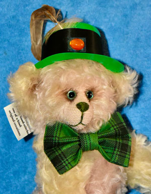 McGreger is about 14 inches tall standing with his leprechaun hat, or about 10 inches sitting. He has curly light green and lavender mohair. His eyes are green glass, with dark green nose and mouth stitching. His paw pads are dark green velvet. McGreger sports a big green and black plaid bow tie and his green leprechaun hat with an orange stone and a feather. His facial expression looks a bit surprised, as if you may have caught him doing a trick. McGreger loves to garden; he magically makes plants grow.... but he has to keep Donny Dibs Bunny out of his garden, because Donny steals carrots. You can adopt McGreger for $295. including shipping and insurance within the US. Buyers outside the US, email me for a shipping quote, which will be billed separately after you pay for McGreger. If you want to discuss lay away, email me at brownlindaellen@gmail.com