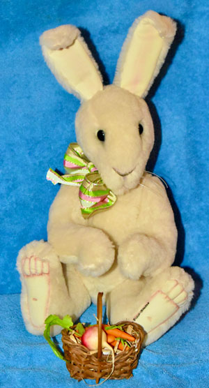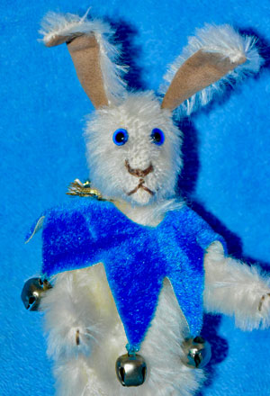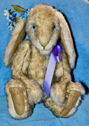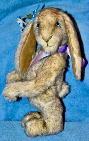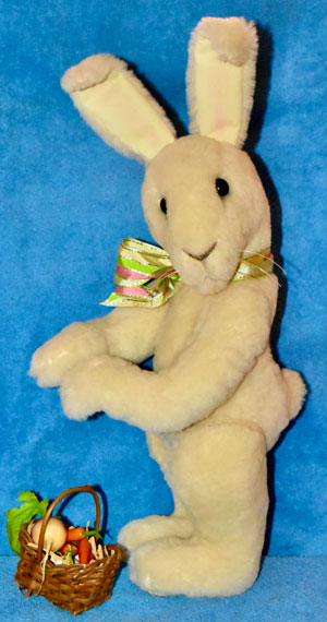 Sam, the snowshoe bunny is 15 to 20 inches tall, depending on whether his ears are up or down. He is made of soft white alpaca fur, with suede foot pads and inner ears. He has shiny black eyes, a hand-stitched taupe color nose and mouth, and nylon whiskers. The big feet have trapunto sculpted toes, and he is signed on a foot.