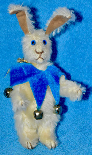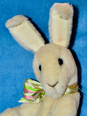 Peter is a little white rabbit with big blue glass eyes, standing about 7.5 inches tall, including his bendable ears, or about 6 inches tall with them down. Sitting, he is just under 5 inches, up to 6.5 inches when his ears are up. His fur is soft white mohair. The nose and mouth are hand-stitched with taupe floss, as are the toes.