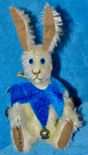 Penelope is a 15 inch tall mohair bunny with blue glass eyes. She has white mohair fur, gently tipped with brown, and brown felt foot pads on her big feet , featuring trapunto needle-sculpted toes. She has a brown hand-stitched nose and mouth and big floppy ears with brown felt linings. She is 11 inches tall when sitting. Penelope has a smiling expression; she is such a sweet bunny! Penelope would be so happy to be adopted and come live with you. She is $350. including shipping and insurance within the US. Buyers outside the US, email me for a shipping quote, which will be billed separately after you pay for Penelope. If you want to discuss lay away, please email me at brownlindaellen@gmail.com