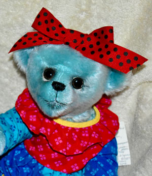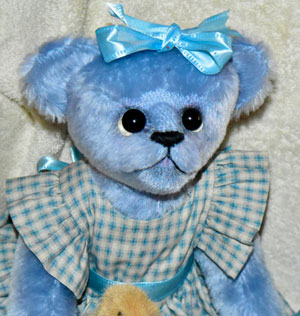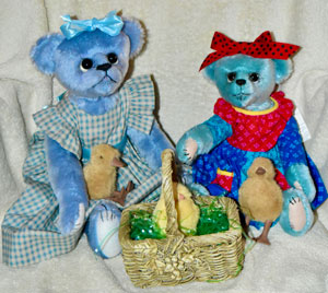 Penny and Patty are mother and daughter, playing with baby chicks in a basket. Penny, the mother, is cuddling a fluffy chick on her lap. She is wearing a blue and white check pinafore. Penny has shiny black eyes with white edging, and a black hand-stitched nose, mouth and claws. She has soft blue mohair fur with white felt paw pads. Her facial expression is both curious and amused. Penny is 16 inches tall (10.5 inches sitting).