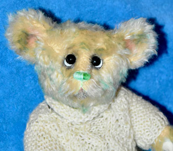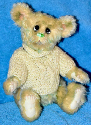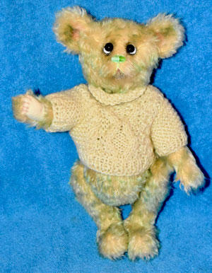 Shawn is a 12 inch tall mohair bear wearing a white wool Irish sweater. His mohair is a cream color with light green tipping. Shawn has shiny black eyes with white edging, and a two-color green hand-stitched nose. He has white felt paw pads with trapunto needle sculpted toes. Shawn has a rather quizzical expression, as if he is pleading with you to adopt him. You can adopt Shawn for $275. including shipping and insurance within the US. Buyers outside the US, email me for a shipping quote, which will be billed separately after you pay for Shawn. If you want to discus lat away, email me at brownlindaellen@gmail.com